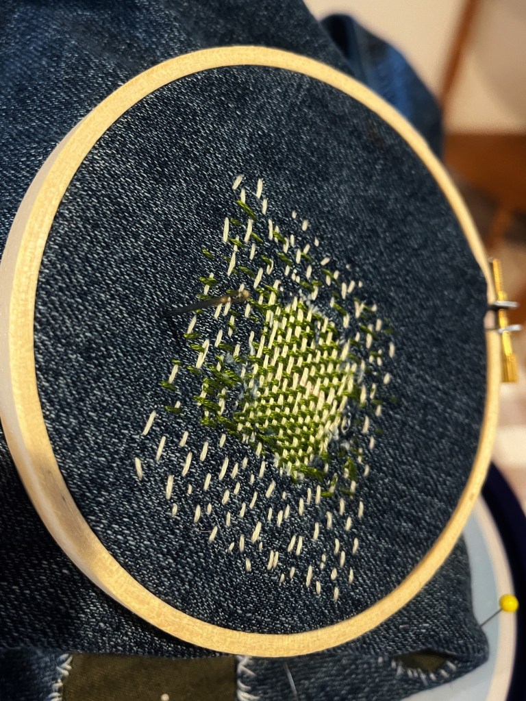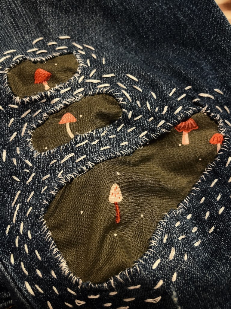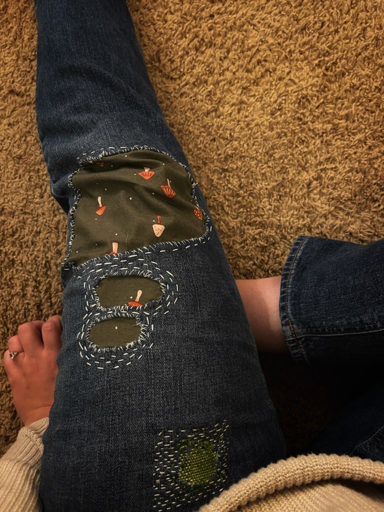 In their book, they talk about mending as an act of healing. I used to hesitate to mend my garments. Patches are obvious, and I’m not a skilled seamstress so they never look quite perfect. Plus, it’s easy to go out and buy new jeans instead of taking the time to patch an old pair. But their discussion of mending as healing transformed patches in my mind. Instead of being unkempt, they’re now a physical manifestation of brokenness made whole. They’re an opportunity for art.