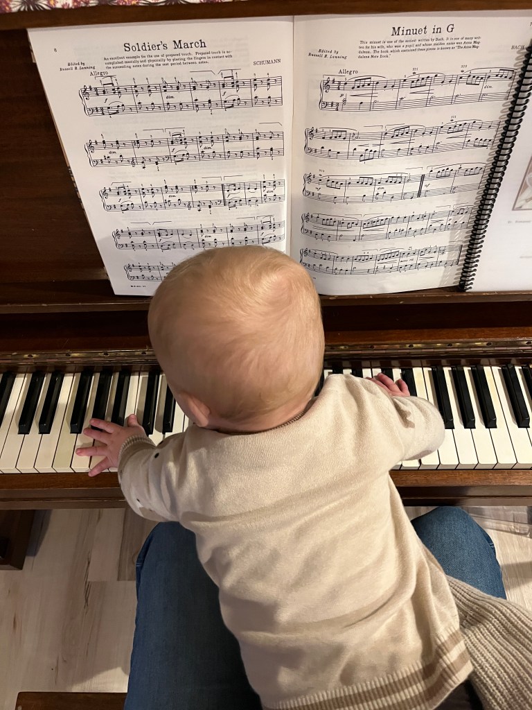 He loves music and now plays the piano almost daily, insisting on sitting on my lap and watching my hands move and joining in.