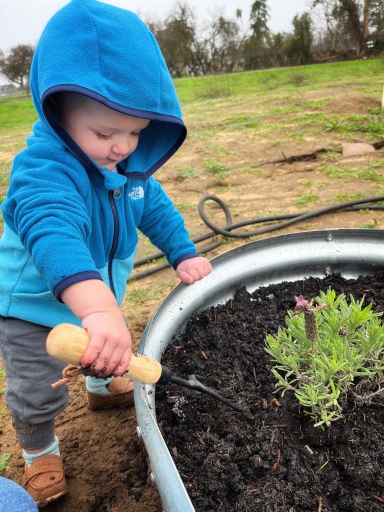 I loved watching him explore with his hands and help me pack the dirt around the roots. Even after we had transplanted both the lavender and rosemary, he wanted to stay and toddle around the beds, one hand holding my spade.