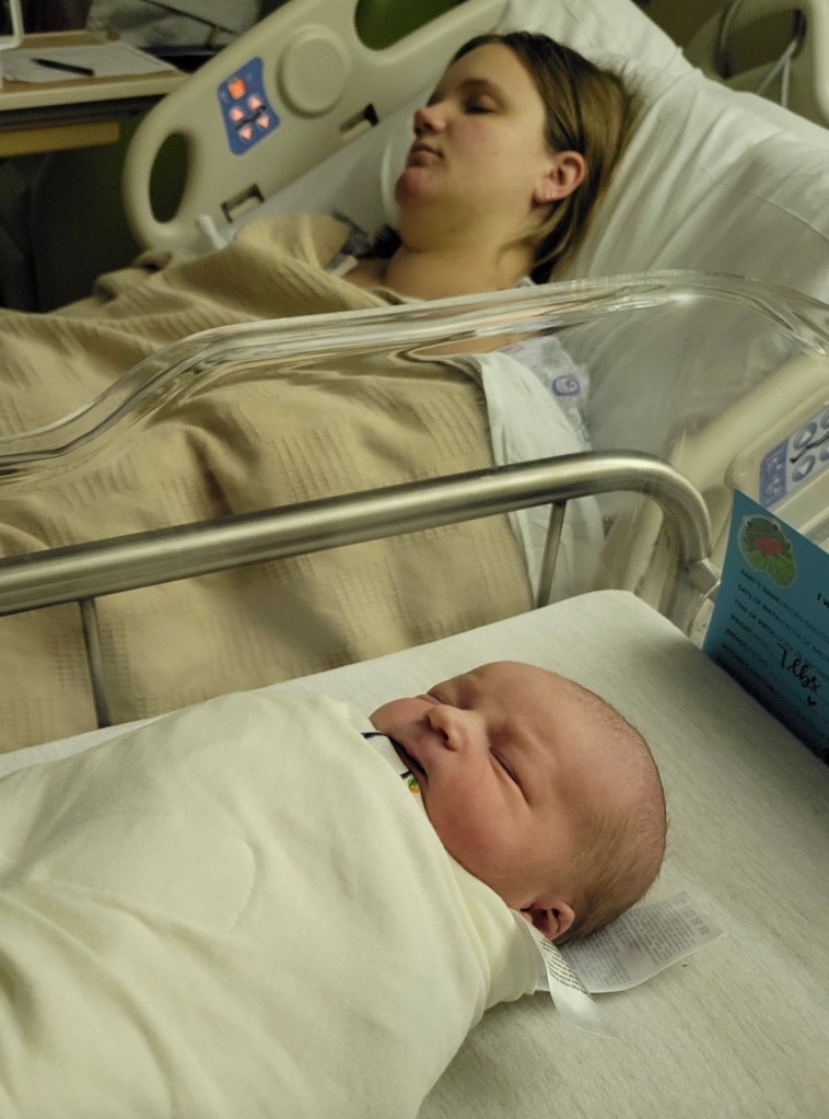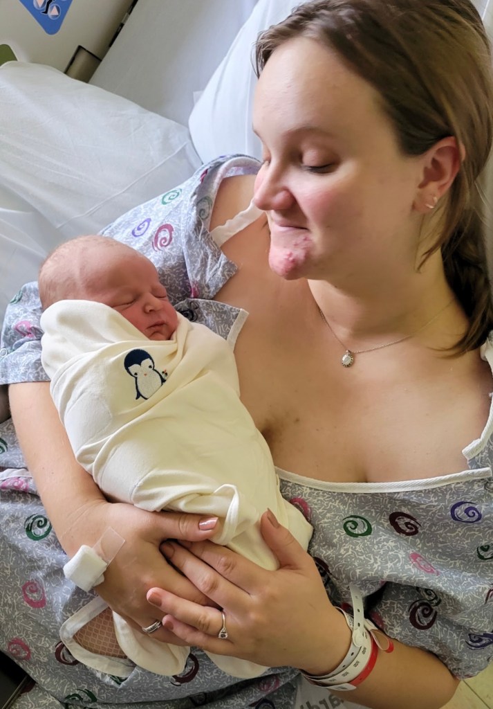 Without any of our prepped bags, we headed over to the hospital around 11 am. I quickly ate a granola bar since I hadn’t had breakfast due to the early appointment time. We were both in a bit of a daze as we filled out the paperwork and made our way to the labor and delivery ward. I wanted both Jake and my mother with me during labor, but due to COVID regulations, my mom couldn’t join us til I tested negative. I was grateful Jake had come along to this appointment — otherwise I would’ve been by myself for quite a while. So we sat and waited as I was poked and prodded (they blew two veins trying to get an IV in me), started on Pitocin, and had a cooks catheter inserted to help with cervical dilation. I was 4 cm dilated and 50% effaced, and the baby was at a -2: a bit too high in my pelvis.