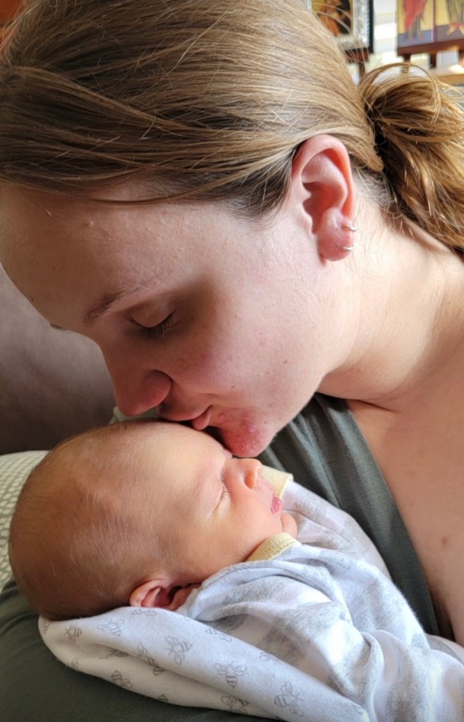 Early afternoon I began to feel pain on my right hip, even through the epidural. No amount of position changing or epidural dosage increasing would get rid of it. As it increased, I felt the urge to push. I pushed for two hours, in a primal haze of pain and determination. At one point Jake was speaking to me, and my brain couldn’t understand the words he was saying. I just needed to push, and meet my baby. I had the icon of the Theotokos, our Helper in Childbirth, on my pillow (given to me by my wonderful friend Catie) and I rested my forehead on it between pushes, the Jesus Prayer the only words I could formulate in my head.