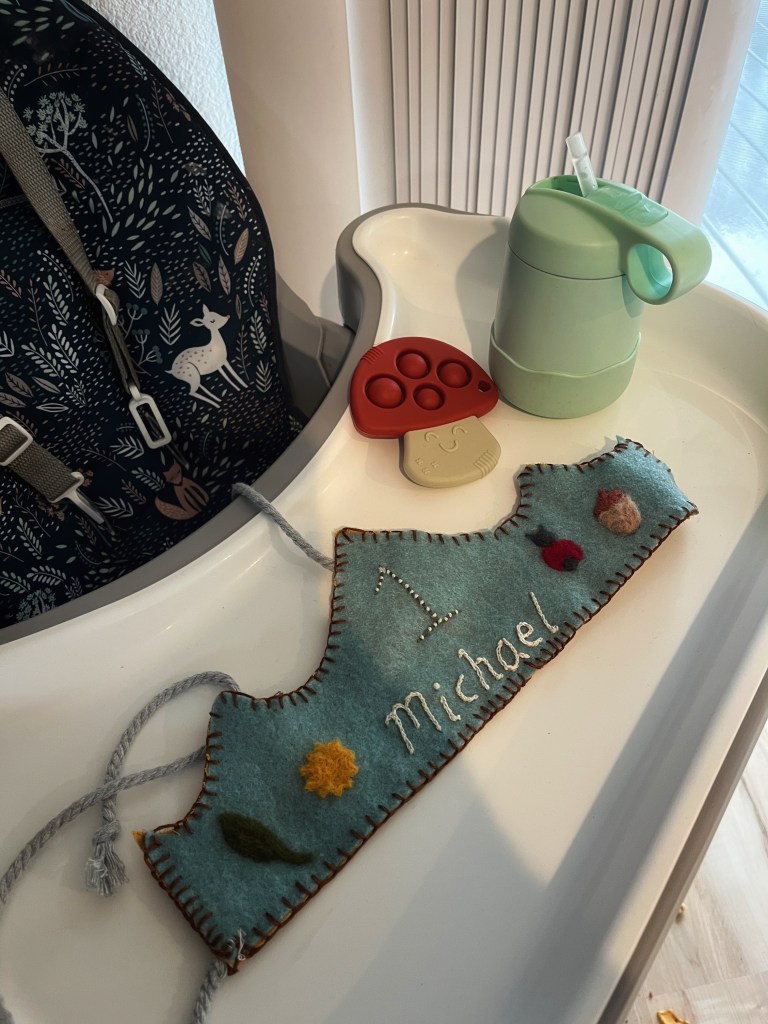 I also made him a birthday crown. I’m hoping to keep up the tradition as the years continue, embroidering or felting something on each that reflects an aspect of my child’s interests and loves. For this one, I felted a leaf, a sun, a ladybug, and an acorn — to capture Michael’s love of the outdoors and his curiosity about the world around him.