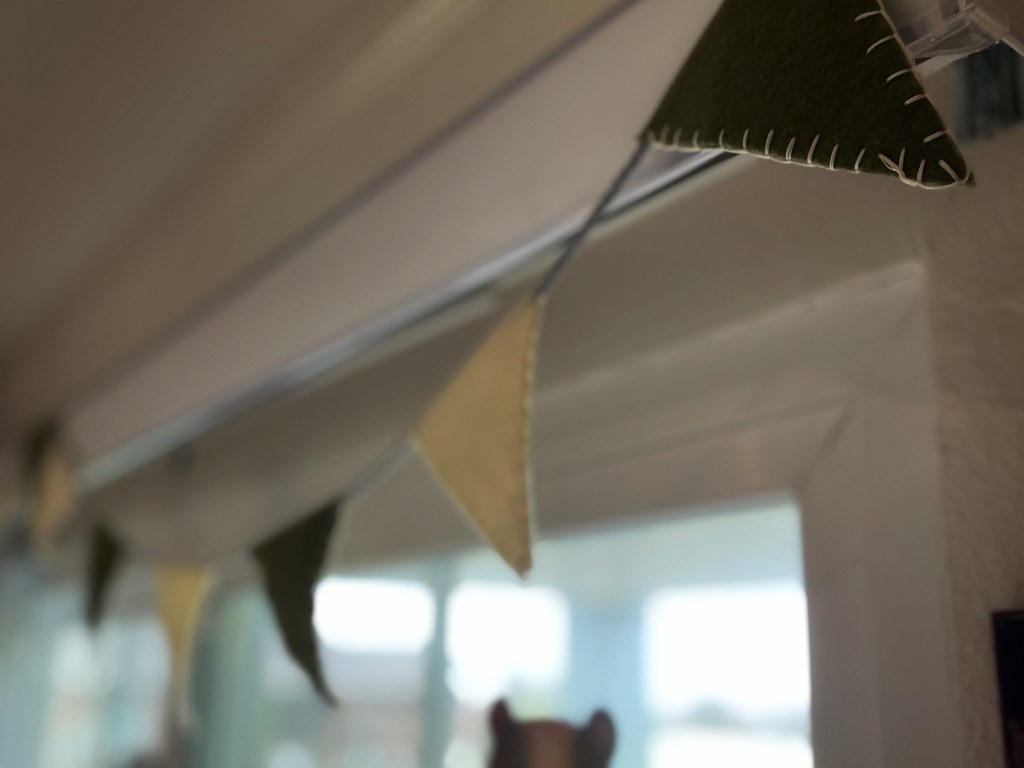 Using felt and some macrame rope, I stitched together some bunting that matched the colors of his room and went with our Hobbit-themed party. My blanket stitch wasn’t perfect (those pesky corners) but I love the handmade look and Michael doesn’t seem to mind. It now hangs over his window in his bedroom.