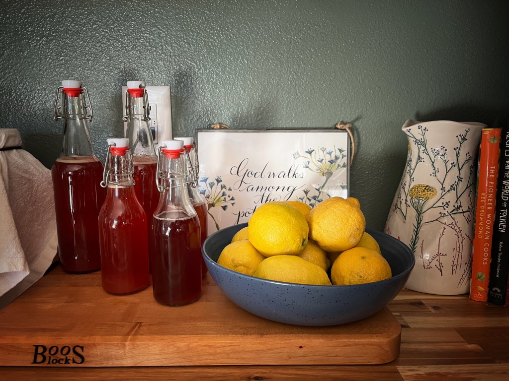Because it’s summer, I’ve been focusing more on cooking and preserving the bounty before us. My current obsession is kombucha flavored with herbs from our garden and honey from our bees. So far, I’ve made a raspberry honey mint, a lavender, and a blueberry honey mint. The raspberry is my favorite.