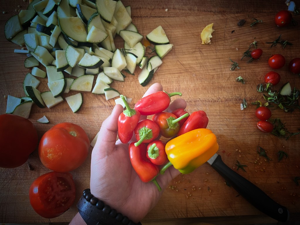 There’s something so satisfying about eating food you’ve grown yourself. I’m pretty proud of this little garden of mine: it’s my first attempt, and though I’ve got much to learn and have made many mistakes, I love my imperfect unpruned tomatoes, tiny peppers, and overgrown zucchini.