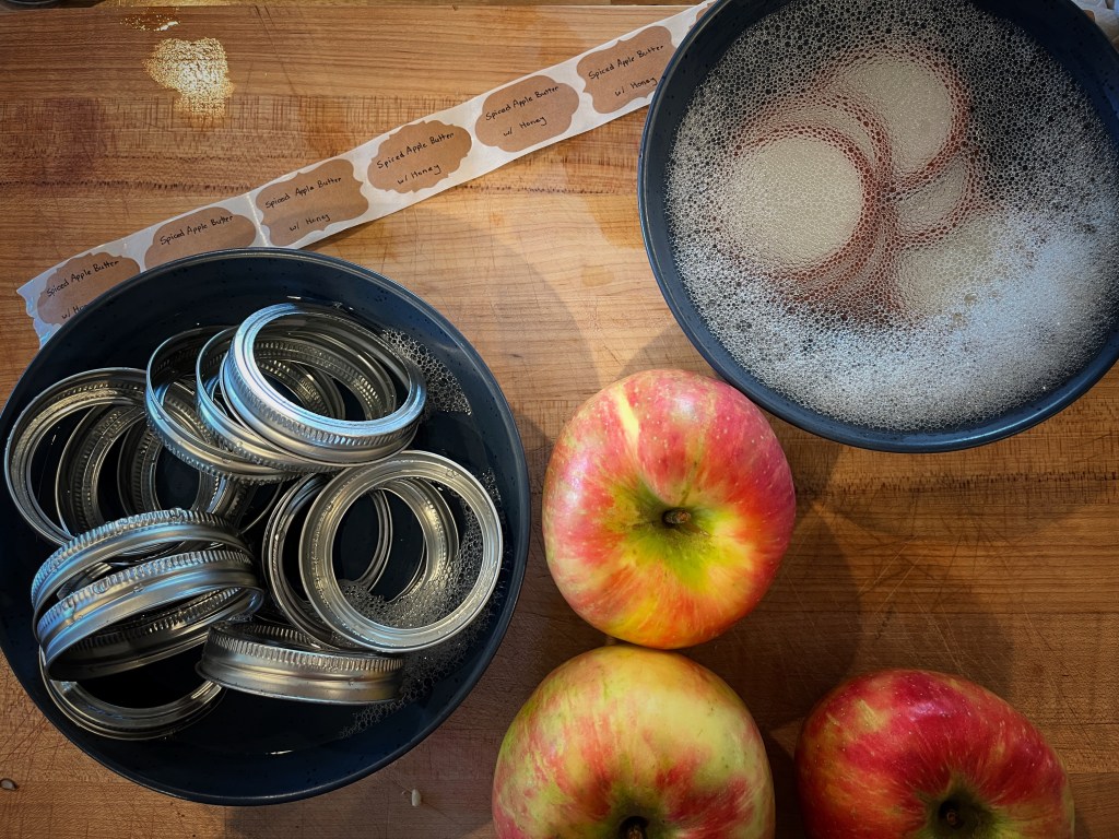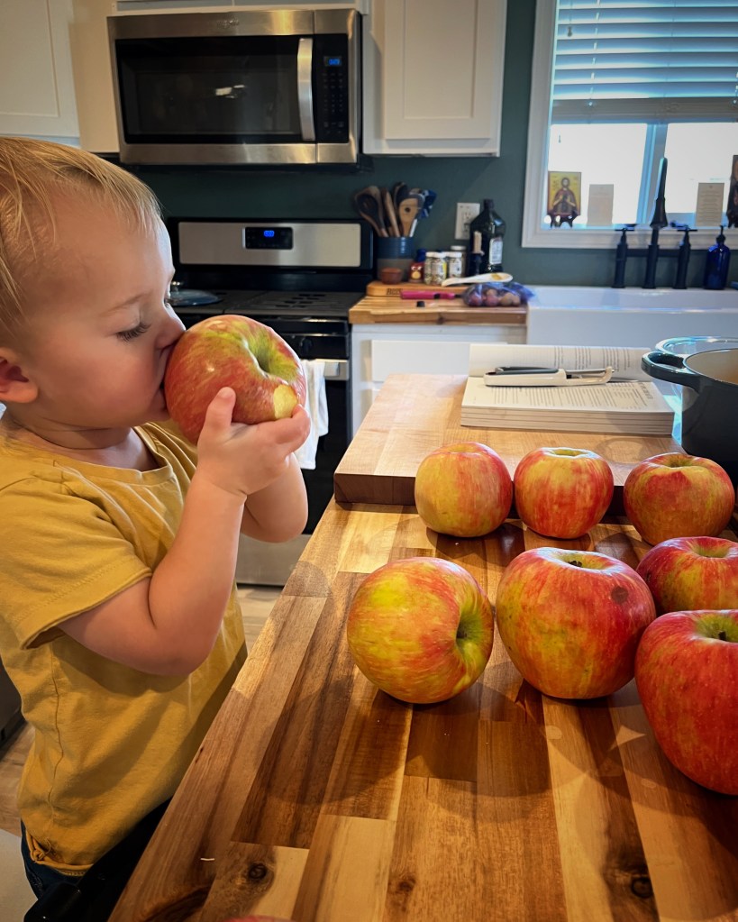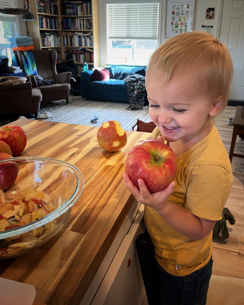 Michael helped me by taste-testing many of the apples and throwing the peels into the scrap bowl. I felt a bit like one of Macbeth’s witches as I stirred the pot and waited for the butter to thicken: it burbled and popped with perfect cauldron sound effects (and got all over the kitchen). Very fitting for October.