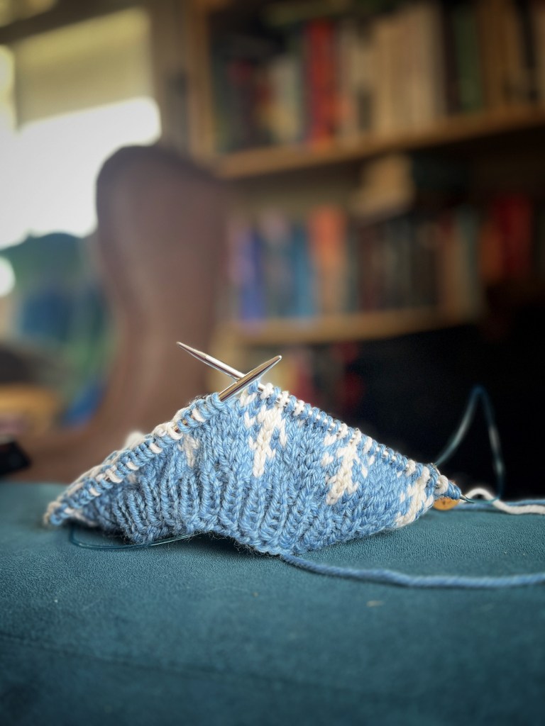 My knitting inspiration has returned in full swing. I’ve finished almost all of the baby gifts I’ve been planning (waiting for the yarn to arrive for the last gift). In total, I’ve completed four projects and started two more. When I mail them all, I’ll post pictures and details. For now, here’s a teaser of Michael’s Christmas sweater.