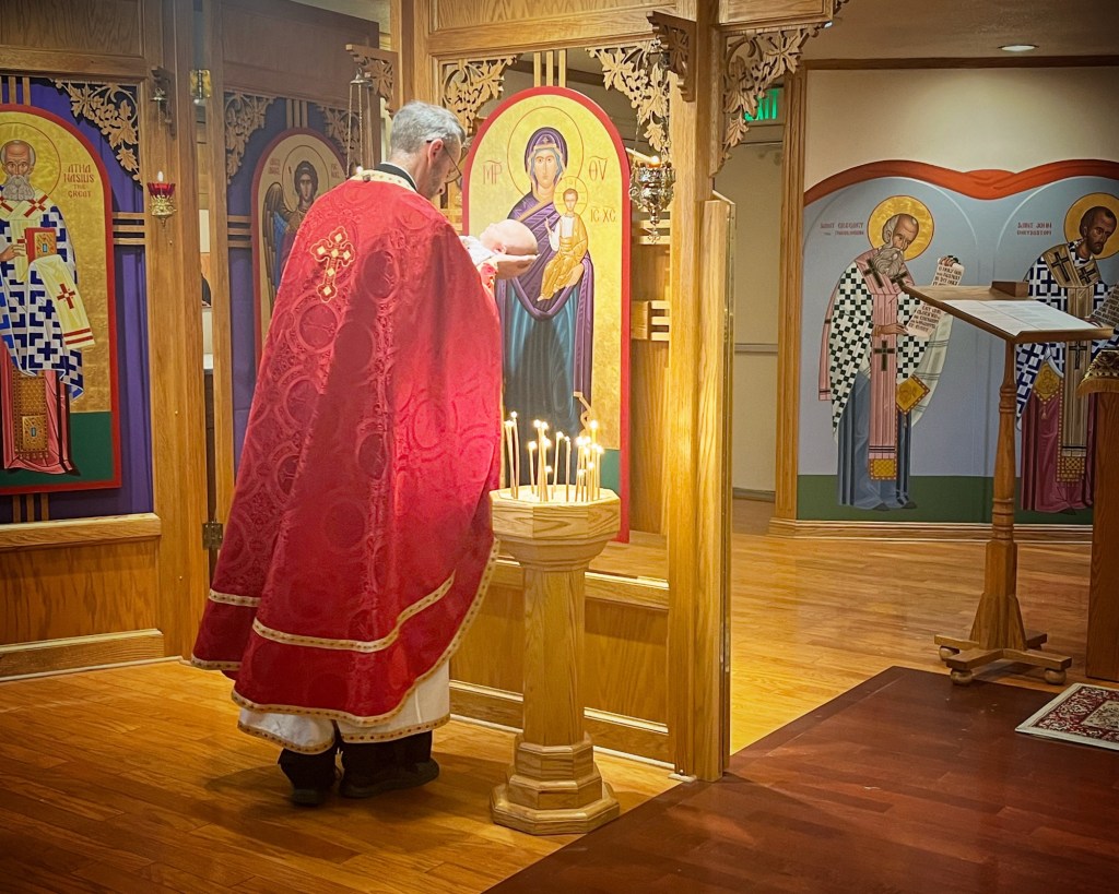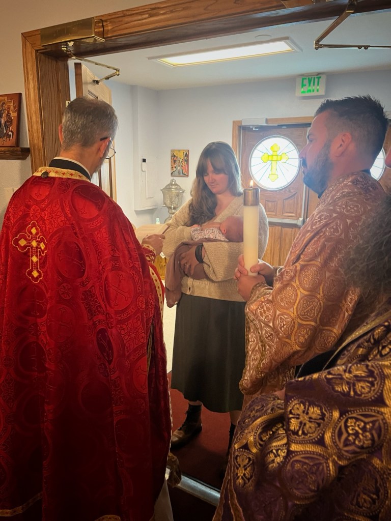 Our priest prayed over me and Beatrice, thanking God for the blessing of a baby and praying I may be fully healed from all parts of the birthing process. Then he took Beatrice and presented her to the Lord, bringing her into the church and back to the altar, and in front of the icons of Christ and the Theotokos.