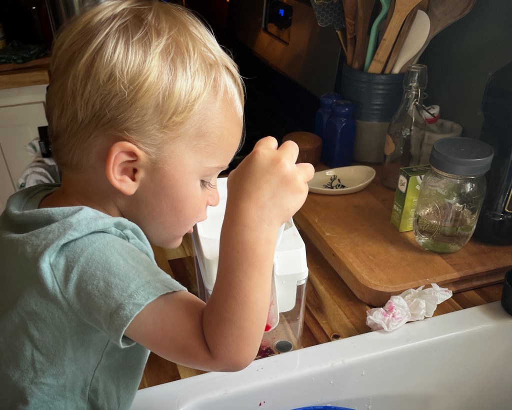 The hallway is his favorite place to play because that’s where he’s allowed to launch projectiles (balls or arrows can’t break anything or hurt anyone there). He’s also obsessed with using tools — from cutting up play-doh or his own snacks to using his play hammer and wrench on imaginary motorcycles and broken engines. His newest games are “playing communion” (with a mason jar, broken crayon pieces, and a spoon or his fingers) and “motorcycles” (scooting up and down the hallway on a blanket).