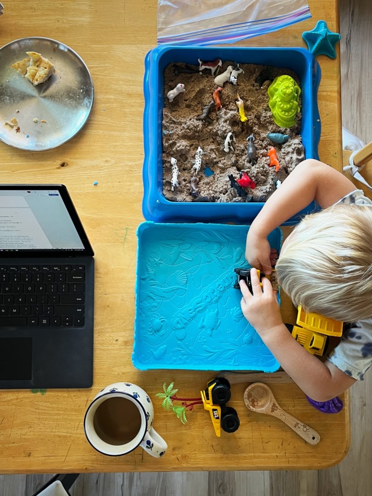Michael recently got a haircut and looks so much older: less like a toddler and more like a little boy. It makes his cowlicks much easier to manage, but seeing him look so grown up makes my heart so full it hurts. His new favorite pastime is playing with “magic sand” with his dump trucks and toy animals.