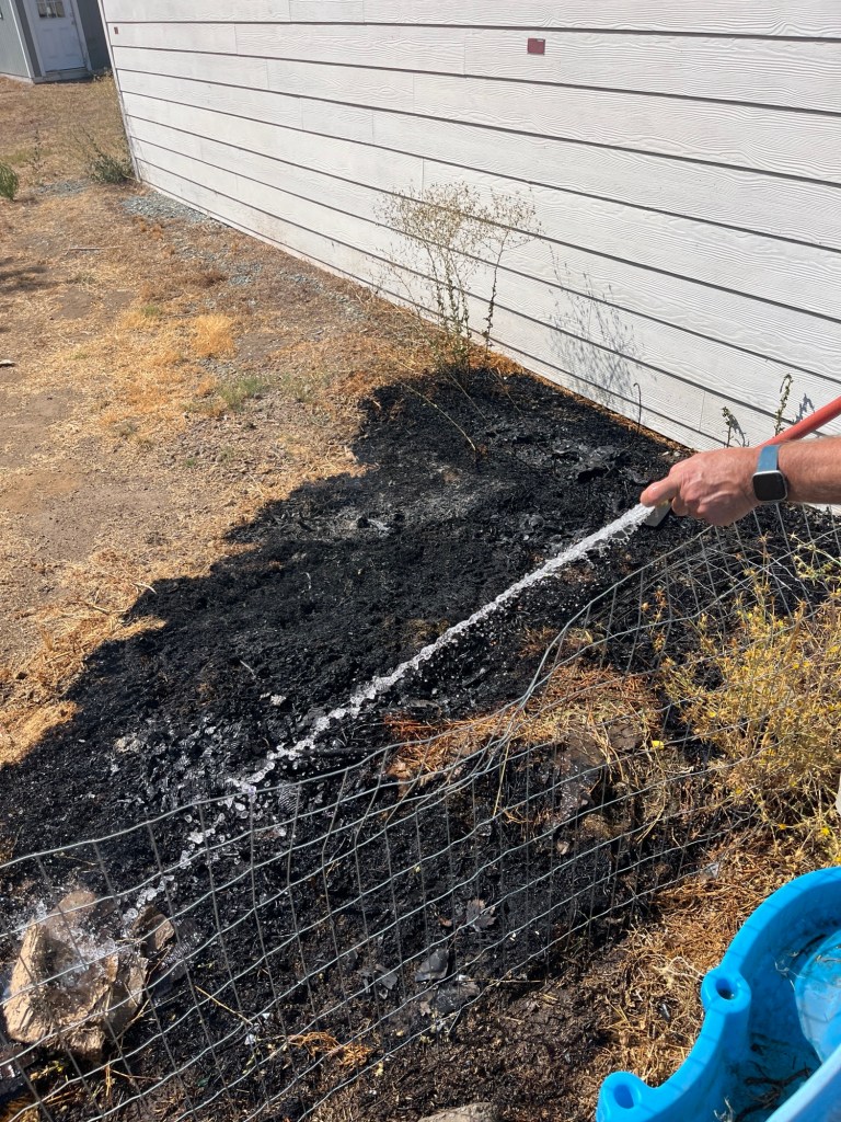 We had a close call accompanying the hot weather. Near the side of our house, we had a few piles of grass clippings and yard waste — not quite a real compost pile. However, with the heat and the decomposition in the piles, the conditions were just right for spontaneous combustion and a grass fire began.