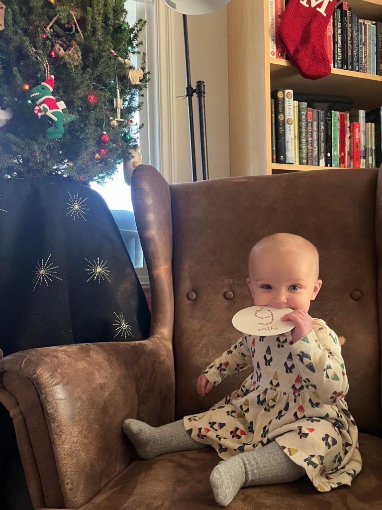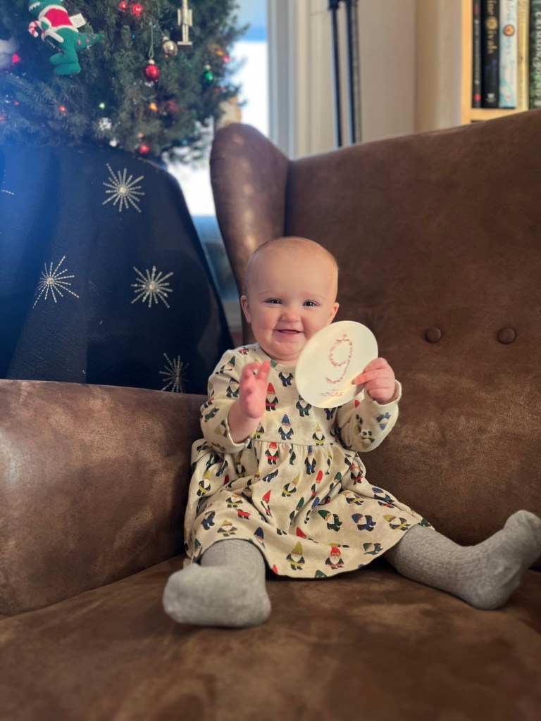 Beatrice turned 9 months old at the beginning of December. She’s such a joy: she proudly sports not one, not two, but three teeth (one on top and two on bottom). She popped her first tooth the day she turned 9 months and it’s been an intense teething fest ever since.
