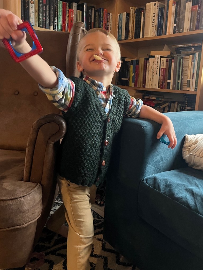 I managed to finish Michael’s Christmas vest in time, but Beatrice’s sweater is woefully unfinished. I’ll try to finish it before her first birthday instead. So enjoy a picture of Michael being a ham and posing with his new vest. It’s made out of a gorgeous yarn my parents brought back from Ireland.