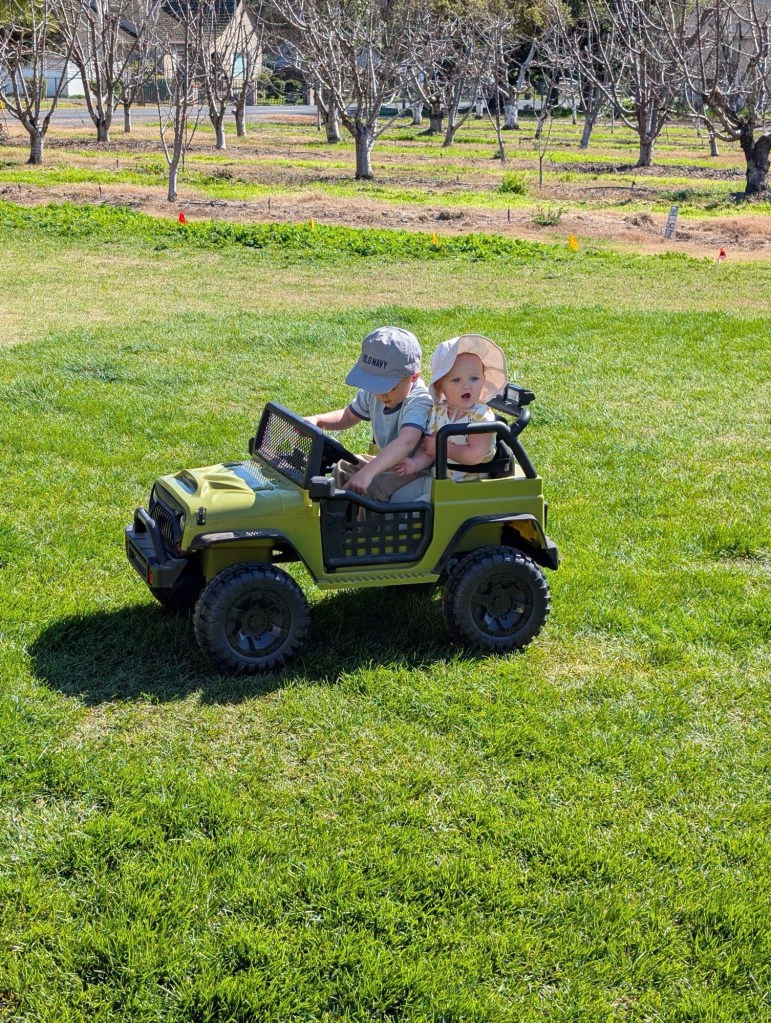 As the weather has warmed up, we’ve spent more time outside. Michael has been driving his little Jeep almost daily and loves it when we buckle Bea in beside him. Bea is obsessed and tries to climb back in whenever we take her out. We’re impressed with how adept Michael is at driving: he now can back up and turn with very little guidance. We have the ability to stop the car remotely if there are any issues, but we don’t steer it for him anymore. And he’s only crashed once in recent days!