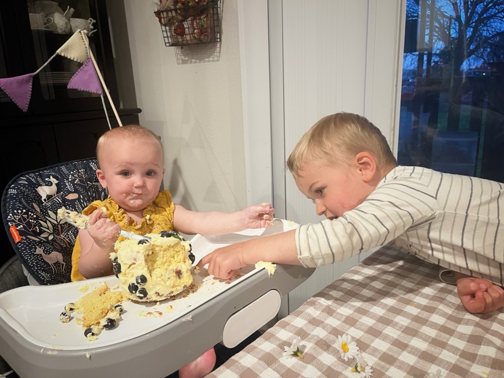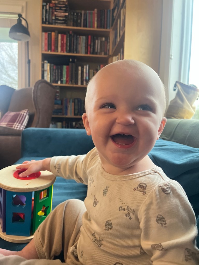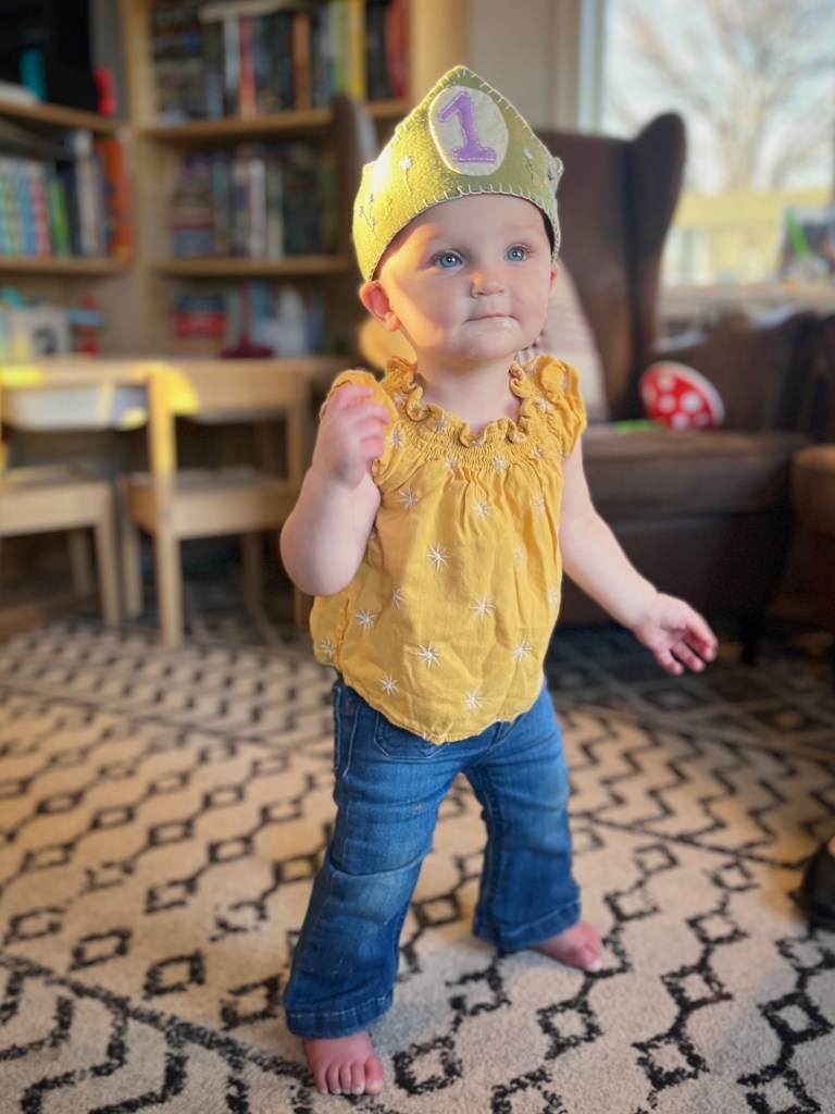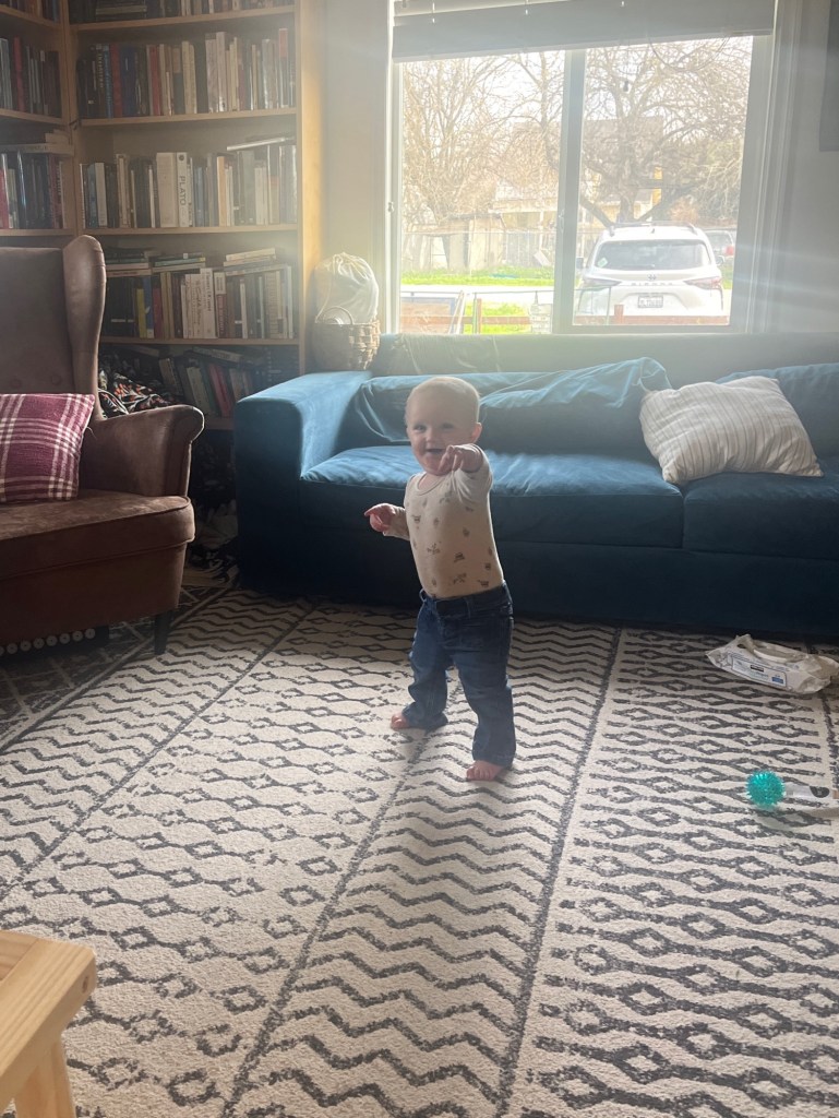 Michael and Bea had checkups recently and are both statistically confirmed as tall and rambunctious. Bea has sprouted tooth #5 and is working on #6 and #7. She continues to prefer crawling, though she’s shown us she will walk multiple steps if under a bit of duress. Her new phrase is “wiggle wiggle wiggle” — it makes Jake and I laugh every time we hear her say it. Whenever someone says “duck” or mentions ducks, she promptly begins quacking. Waving at people is one of her favorite things to do. She continues to use her voice at the top of her lungs, and her favorite foods have expanded to include mozzarella and veggie straws.