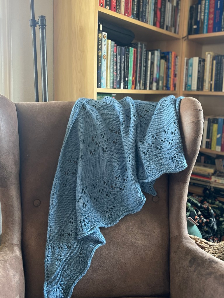 In making news, I blocked my finished blue shawl, and it really bloomed into its lace and shape. The pattern is Open Skies by Andrea Mowry — I loved its simplicity and beauty. It’s a lovely shawl to wear in the chilly mornings as I finish my coffee. Since it was knit out of a worsted weight yarn, it’s very warm and squishy. Michael loves borrowing it and running around the house like a shawl-superhero.
