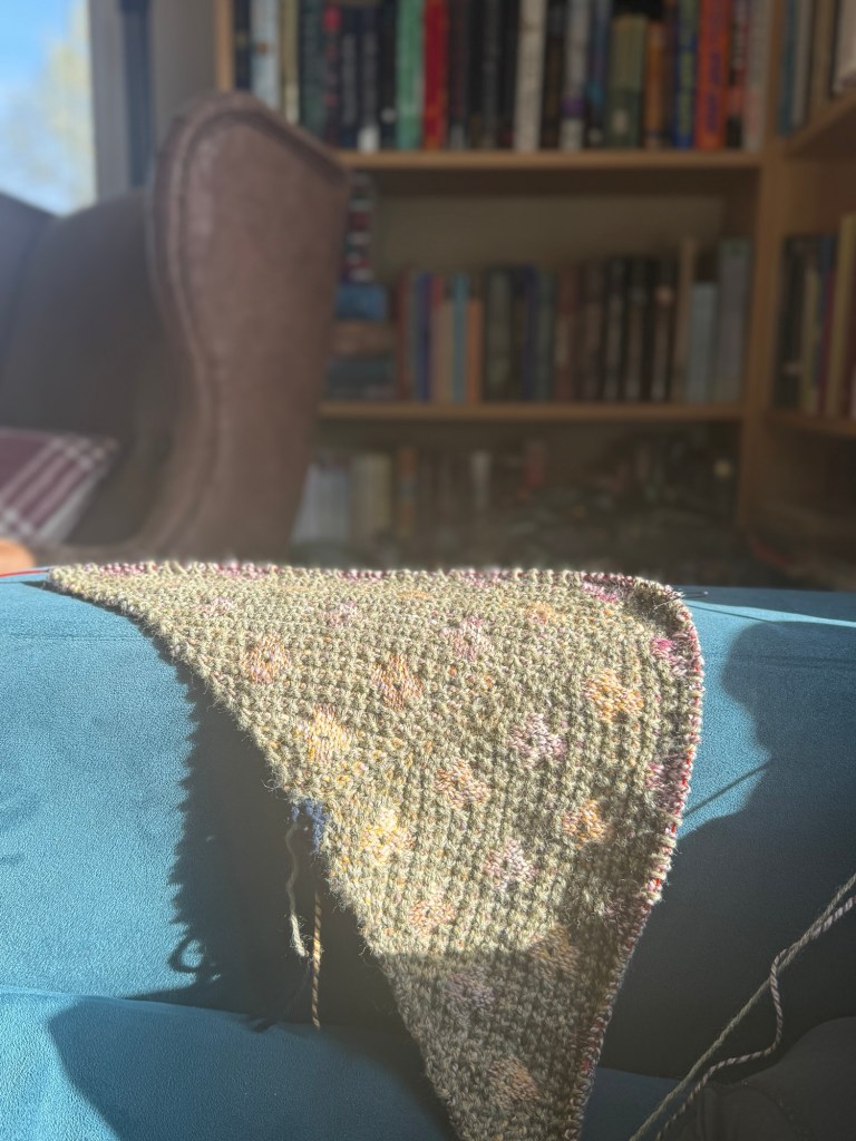 I cast on a new shawl just for fun: Pressed Flowers by Amy Christoffers. It felt like the perfect spring pattern. I’m knitting it purely from leftover project yarn and handspun. It’s a bit lower contrast than I’d expected, but the soft muddy look is growing on me. Also, the texture is a lot of fun.