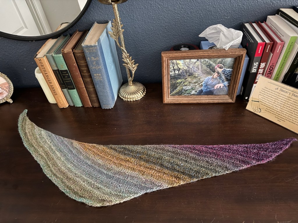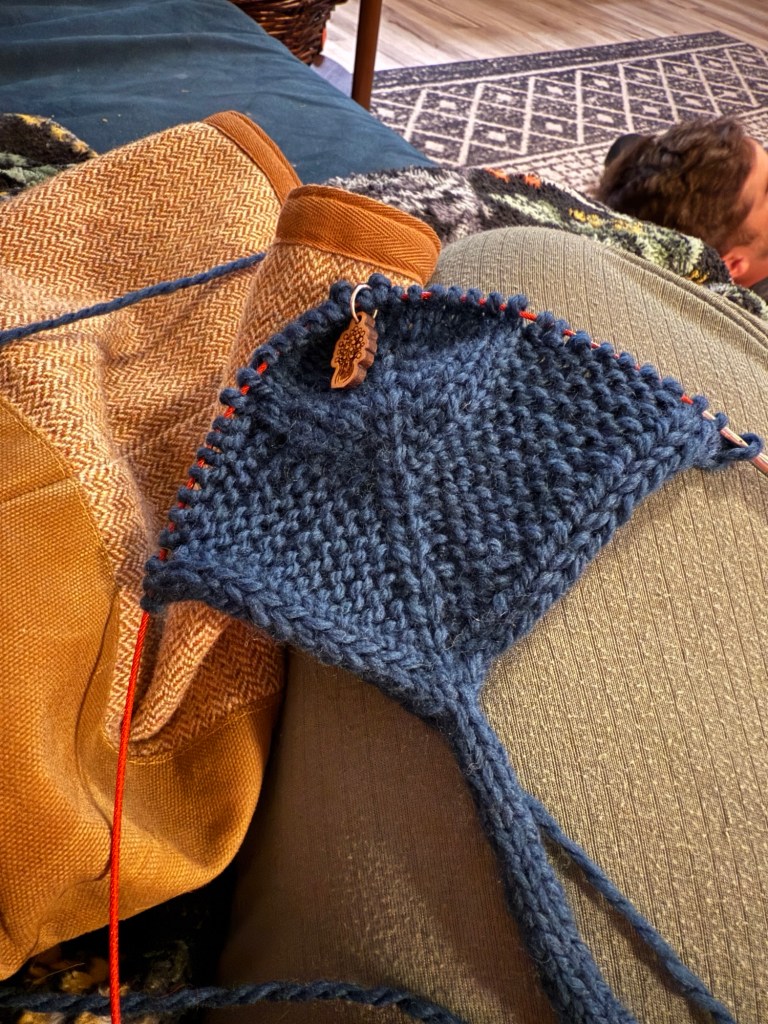 My making continues to take a back seat to life’s current demands. However, I knit a small, light head/neck scarf on the drive down to SoCal from leftover handspun. I made some progress on a pair of socks I’ve been knitting for an embarrassing amount of time. I’m also making another bonnet for a sweet baby at our church.