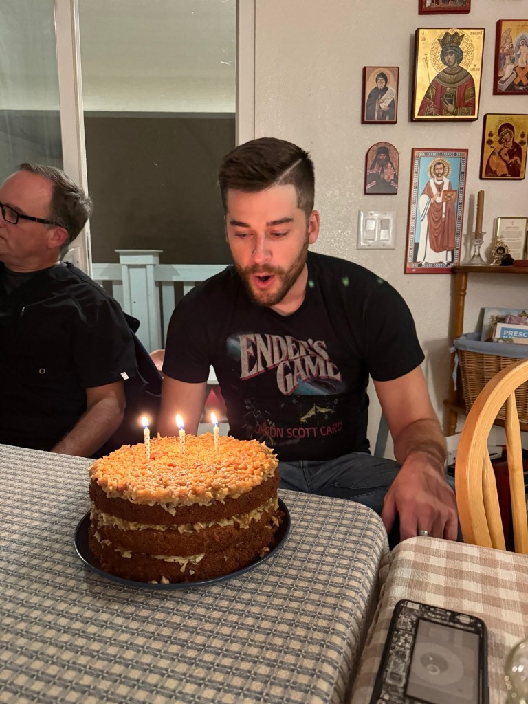 We celebrated Jake’s birthday! On the actual day we visited our favorite local restaurant just the two of us (as we usually do), and the next night I made his favorite cake. I was surprised it turned out as well as it did, given all three layers stuck in their pans…frosting covers a plethora of mistakes.