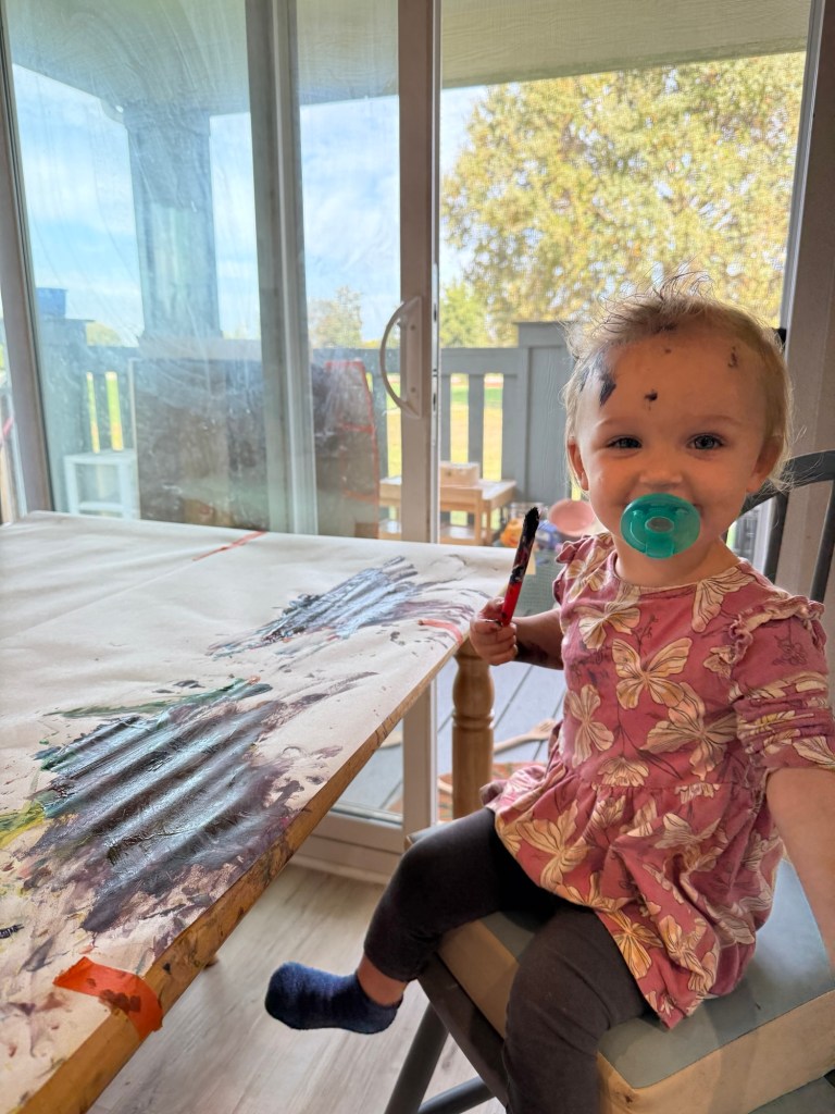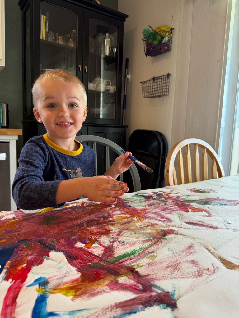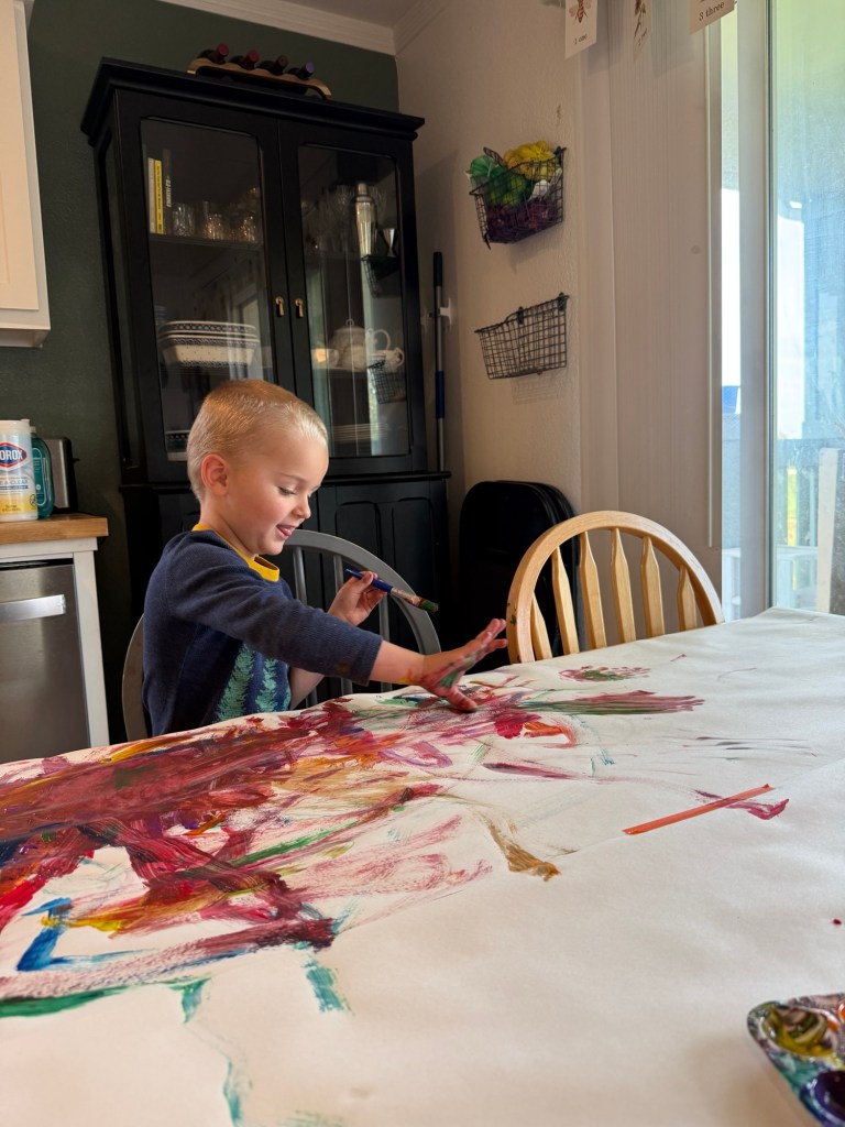 A highlight of our “house arrest” was a painting project where I covered the kitchen table with paper and let them go wild. Lots of fun motor skill development and color theory experiments.