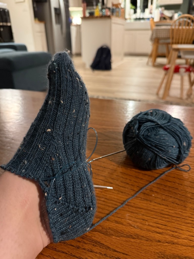 One positive thing about being homebound so much has been my making progress: I’ve done quite a lot of knitting and spinning over the past few weeks. I finished a pair of socks for Jake that I’ve been working on for an embarrassing amount of time…they were originally meant to be a Valentine’s Day gift. Then Father’s Day gift. They ended up being a belated birthday gift. I then immediately cast on a new pair of socks for me and rocketed through the first foot. I’m currently working on the ankle/calf and hoping I won’t lose steam before starting the second.