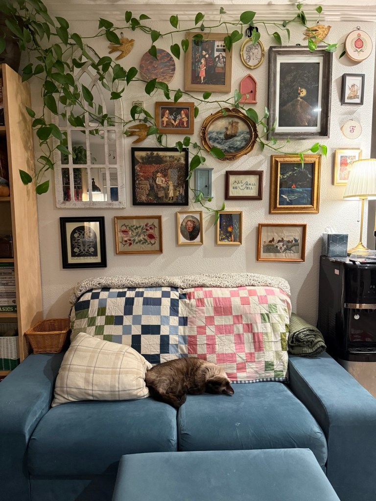 The new sitting place beside our gallery wall has become my favorite spot to wind down. It’s out of sight of the TV, near the record player. It’s surrounded by art I’ve curated and collected (or made myself) for years. I’ve been making a habit of sitting there with a cup of tea and my book or notebook or psalter, even if it’s only for a few minutes a day.