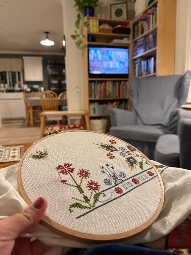 Now Jake is home, my deadlines are met, and personal writing and crafting projects are returning to the forefront of my mind. I’ve been slowly chipping away at my cross-stitch project in the evenings, as it works different hand muscles and takes less brain space for me. I also cast on a new little project (don’t ask me how many works in progress I have, it’s a bit embarrassing).
