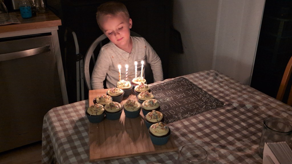 Michael had a birthday earlier this month — I can’t believe my little boy is four years old. I love his enthusiasm for life: he wants to figure out how everything works, he thinks number games are the coolest thing ever (basic addition/subtraction using fingers or random objects), and he still spends every possible waking moment playing outside.