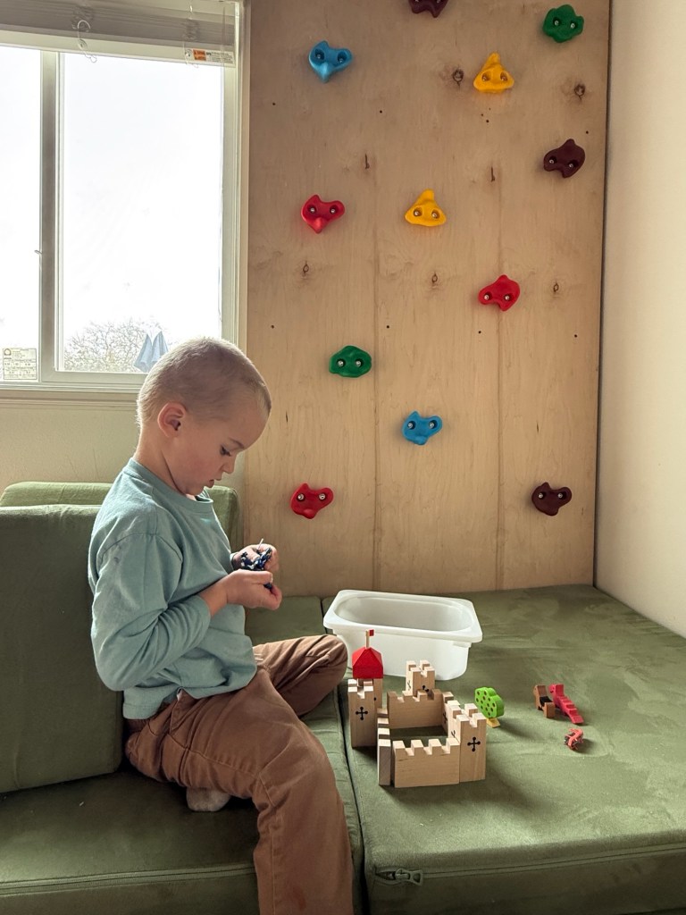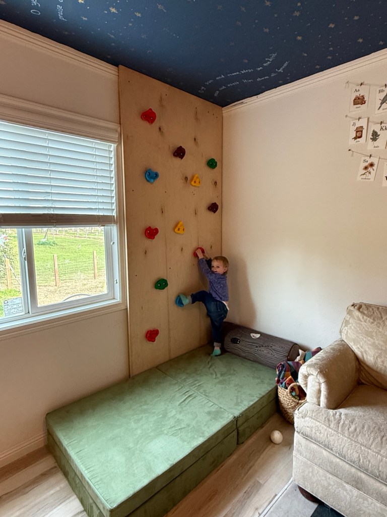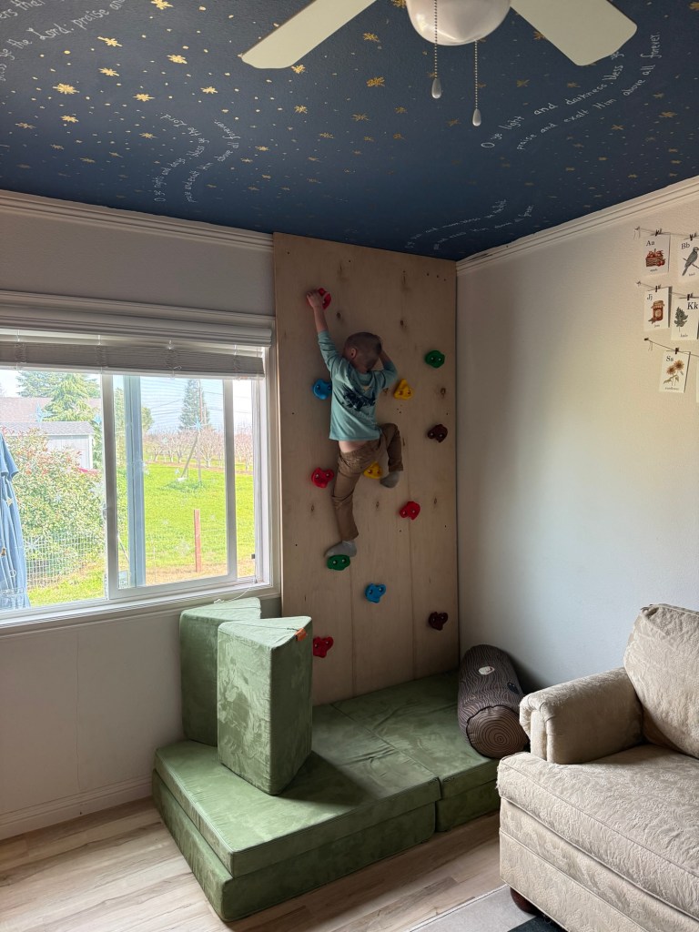 Earlier this month, we finally finished a project we’ve been dreaming of a long time: a rock climbing wall for the kids’ room. Michael absolutely adores it, and it’s wonderful to have an indoor outlet for all that energy when it’s cold and wet outside.