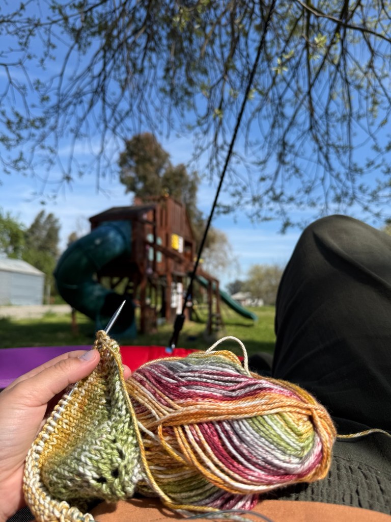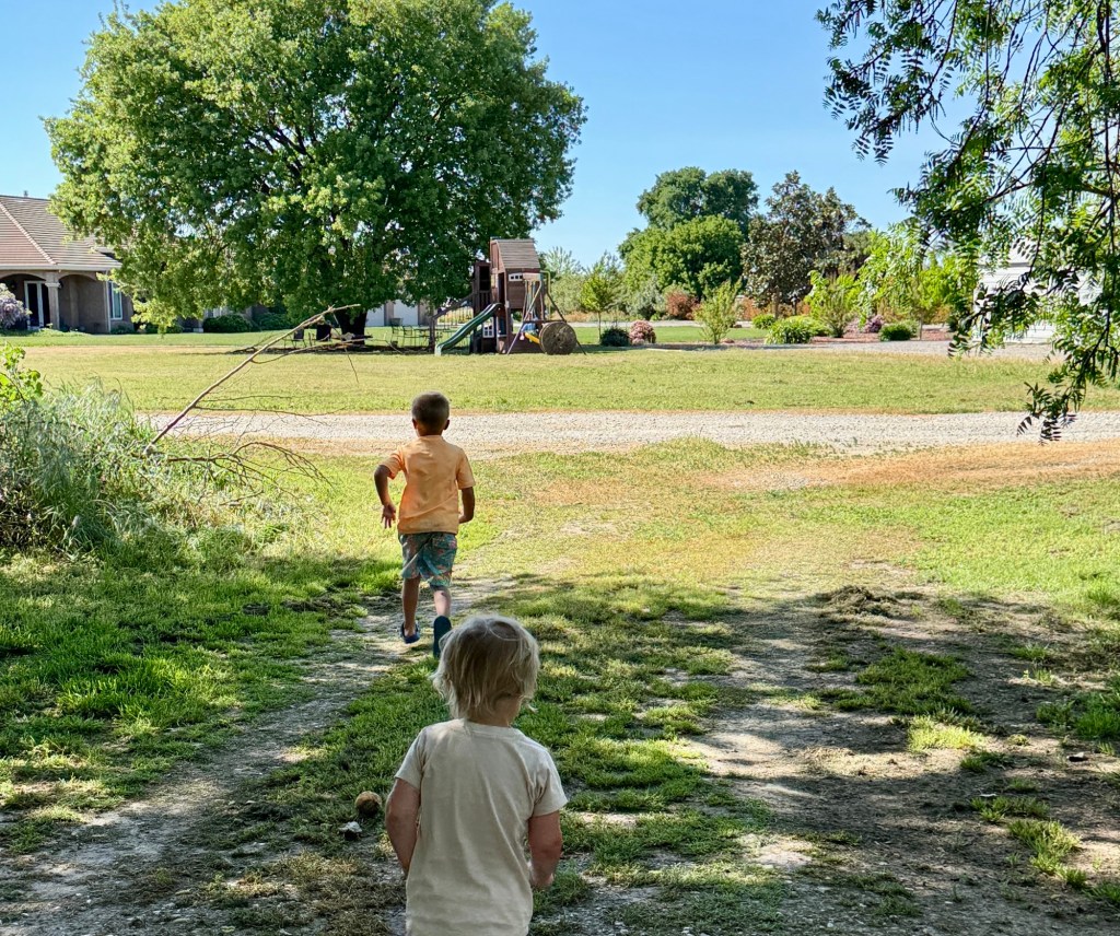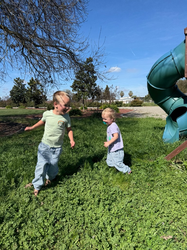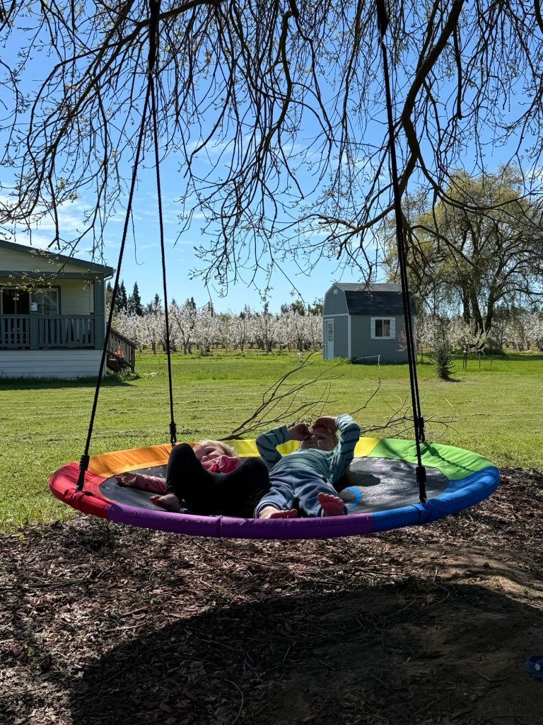 We’ve been weathering a heatwave the past two weeks: the temperatures have been in the high 80s, which is 20 degrees hotter than usual. It’s made playing outside and gardening in the afternoons a bit more difficult, but the mornings are very pleasant. The kids really love playing on their play set, and Michael recently learned how to climb up its fireman pole — he is very proud of himself. We also put up a saucer swing on the nearby California oak tree, and it’s a beautifully peaceful addition: I love laying back and looking at the slivers of blue sky between the unfurling oak leaves and twisting branches.