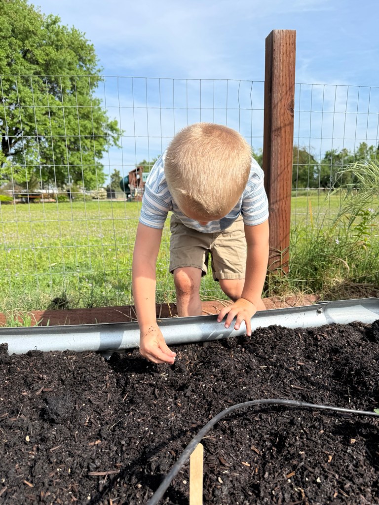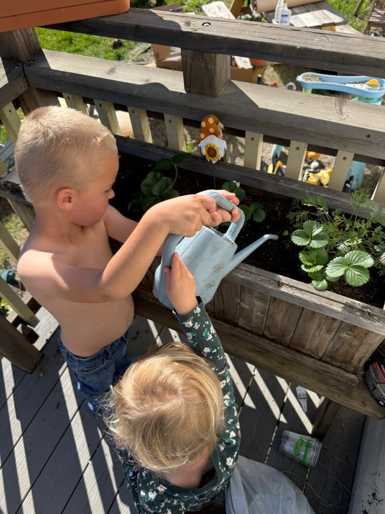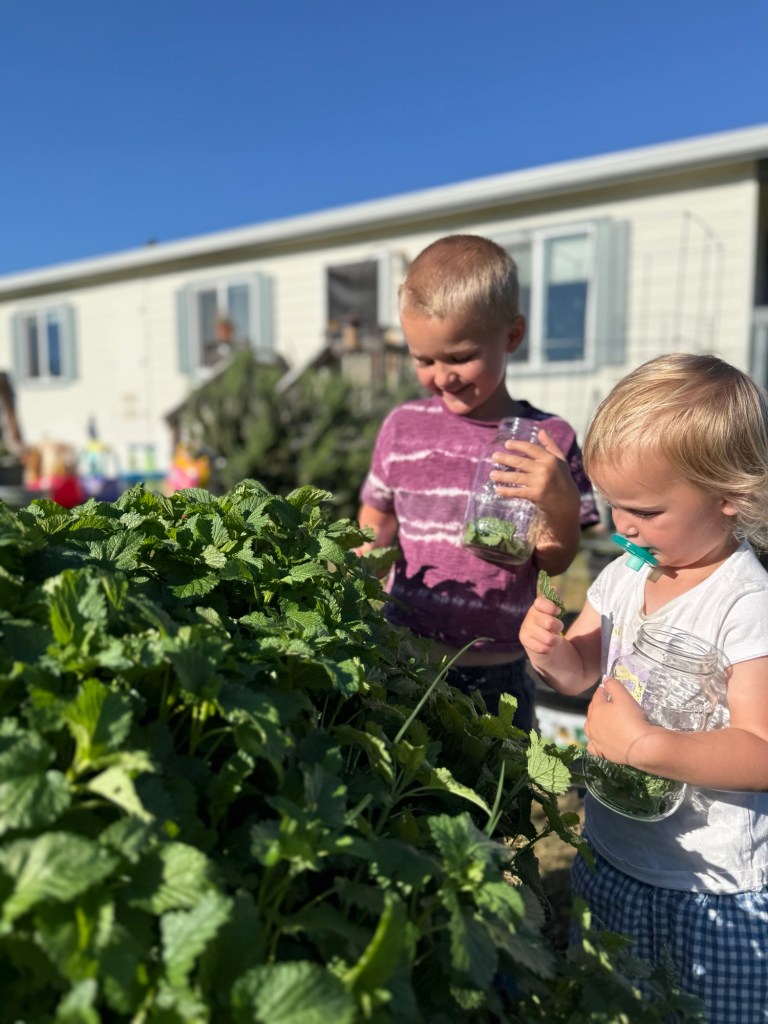 The kids have their own strawberry patch on the porch which they water religiously, checking to see if any of the tiny berries have begun to ripen. They’ve also been helping me harvest our abundance of herbs: most recently we’ve been making sun tea from lemon balm and sweet mint. Every time I have a spot clear to plant, they excitedly rush over to help me pop the tiny seeds in the ground and cover them lovingly with dirt.