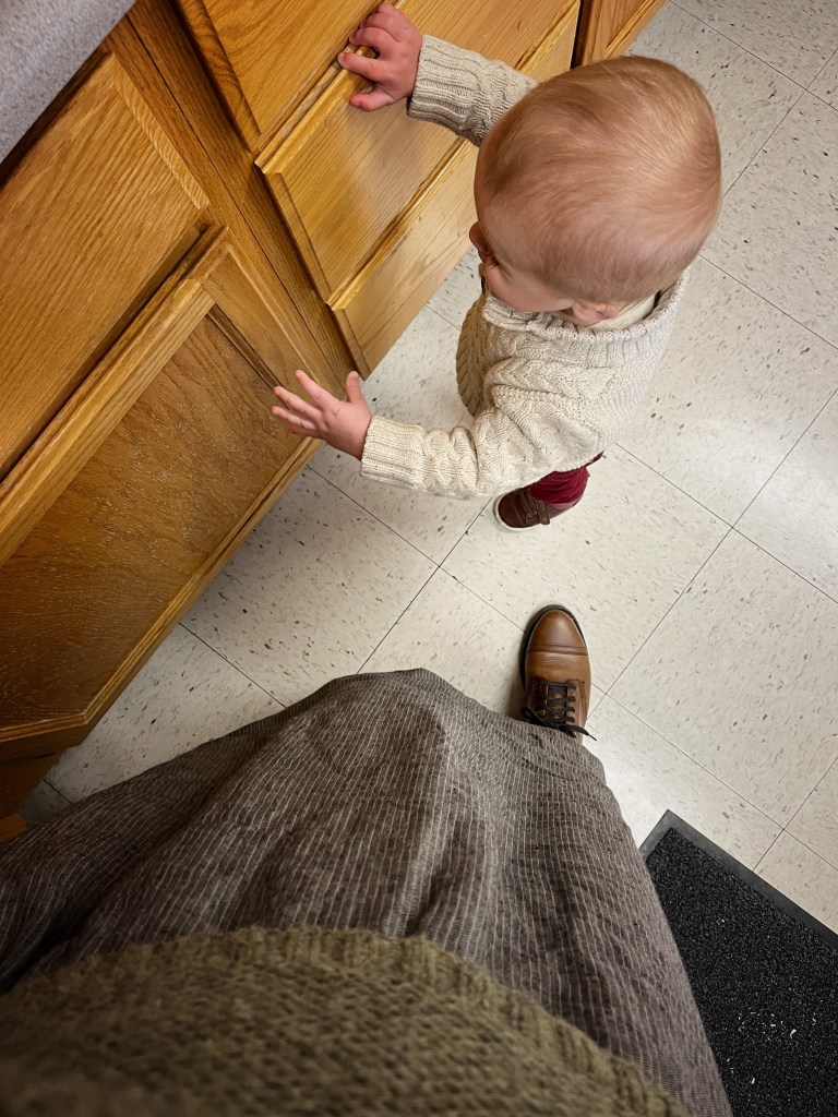 His favorite game is Bonk, which is exactly what it sounds like. He gently (and sometimes not so gently) bonks his forehead against ours and giggles uproariously when we proclaim bonk! (Or sometimes ouch). He also adores opening and closing cabinets. It keeps him quite busy at church during the homily.